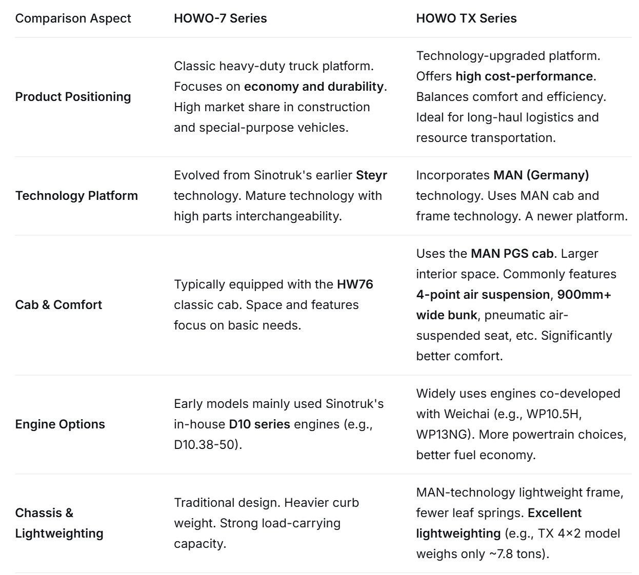 The HOWO-7 and TX series essentially belong to the Sinotruk HOWO family, but they differ significantly in their technology platform, product positioning, and comfort features. Simply put, the HOWO-7 is a "classic veteran" proven in the market, while the TX is a technologically updated "German inheritor."